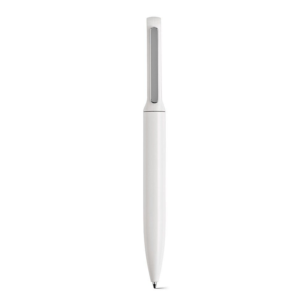 Plato twist action-kuglepen i genbrugsaluminium og en rABS med bambustop. Rotationssystemet frigiver 1 km Dokumental® blåt blæk (1,0 mm spids), alt sammen elegant præsenteret i en individuel bambusæske.
