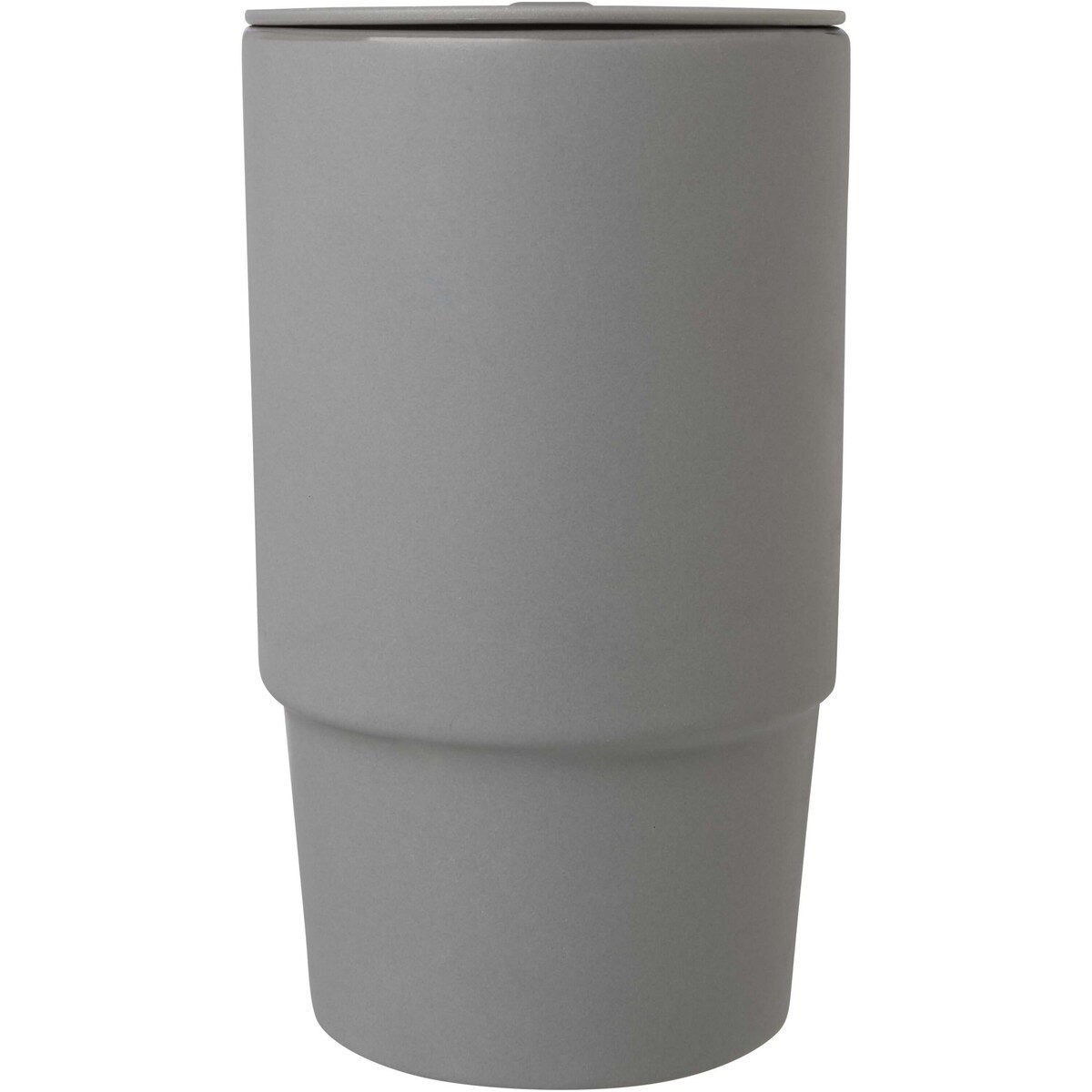 Keramisk krus med et stort, overdimensioneret hank for nem transport og et spildsikkert plastiklåg for bekvemmelighed på farten. Ydersiden har en stilfuld mat finish, og flasken tåler opvaskemaskine til alle trykmetoder. Leveres i en æske af genbrugspap. Kapacitet: 450 ml.