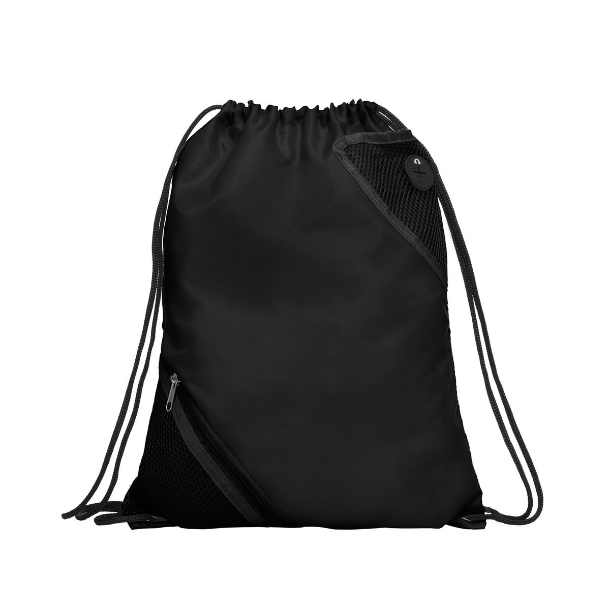 Drawstring backpack in brightly colored 201D polyester, with matching color zippered front pocket and headphones output. Includes matching color mesh pockets with metal eyelet reinforced corners and black self-closing cords.