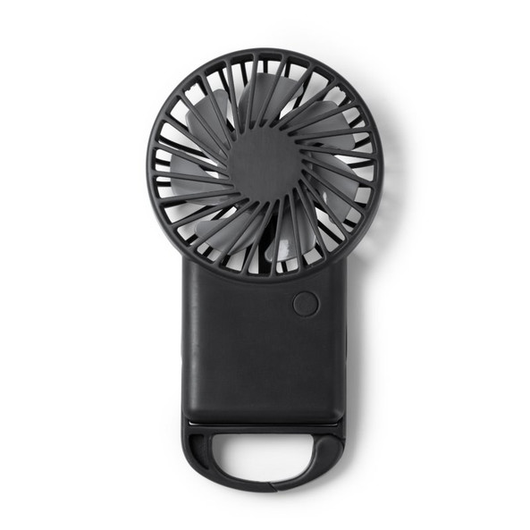 Portable fan with carabiner and built-in smartphone stand. Three speeds. Made of recycled ABS. Includes type-c cable. Supplied in single eco-friendly designed packaging.