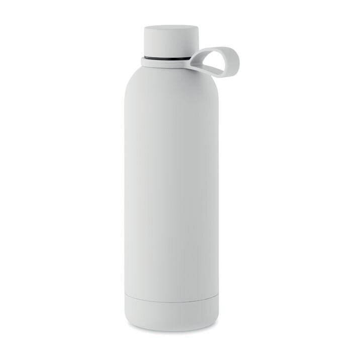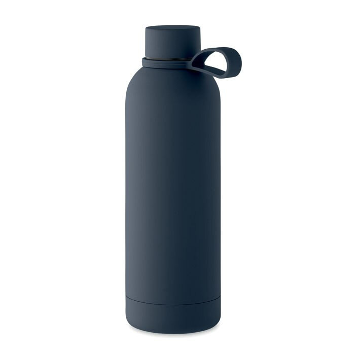 Dobbeltvægget vakuumisolerende flaske i genanvendt rustfrit stål (90 % genanvendt rustfrit stål og 10 % rustfrit stål) med gummifinish og silikonehåndtag.