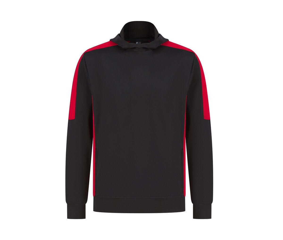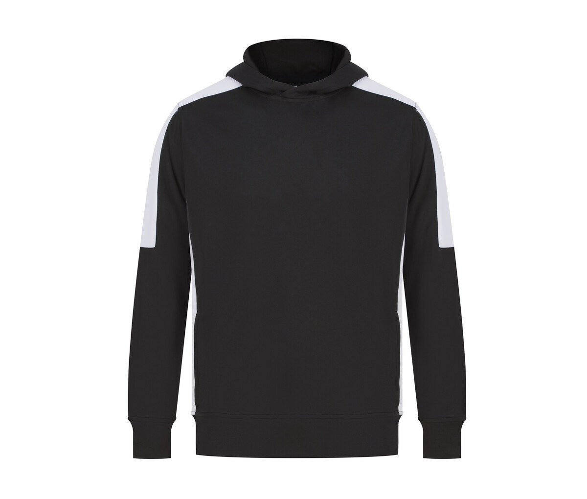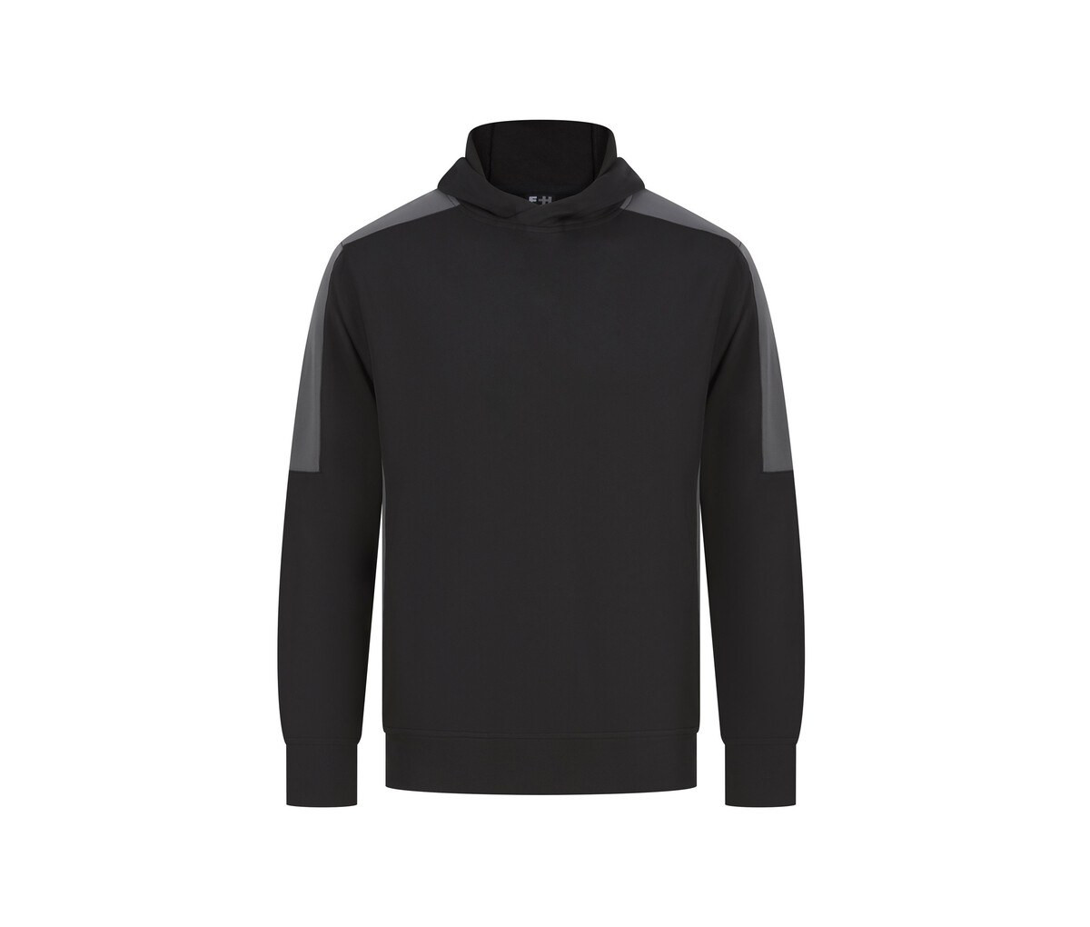 Børstet fleece indvendigt. Sidelommer med lynlås. Kontrastærmer og sidepaneler kun i kontrast. Ribstrikkede manchetter og kant. Krydsende hættehals ved midten foran. Lynlåslomme i sidesømmen på frontpanelet. 3-delt hætte.