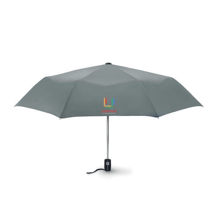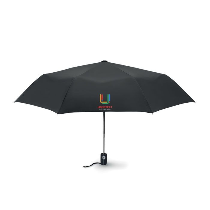 Paraply 21'' De Luxe 3-folds automatisk stormparaply i 190T pongee med forsinket stålskaft, sorte kanter med 2 sektioner glasfiber og krommetalletip, sort gummieret håndtag med doming.