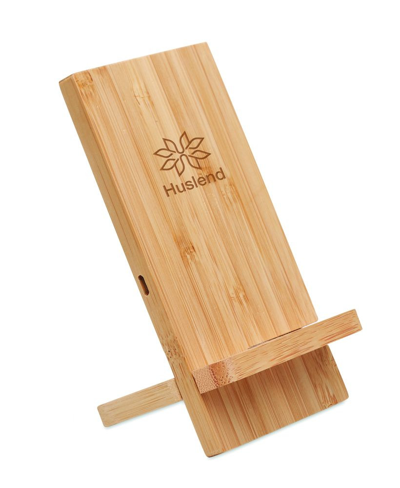Dobbelt spole trådløs opladerstander i bambus. Placer smartphone på den for at begynde opladning. Den inkluderer 2 dele, samling påkrævet. Output: DC 9V/1.1A (10W) til hurtig opladning. Kompatibel med de nyeste Androids, iPhone® 8, X og nyere.