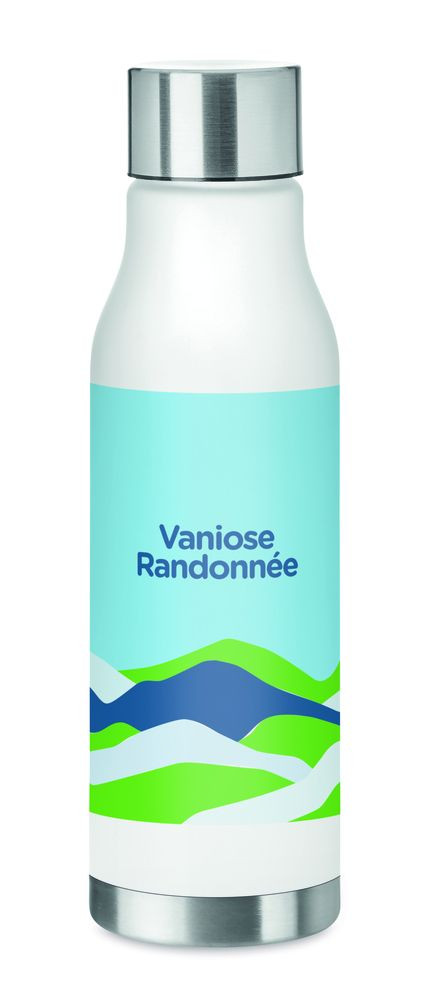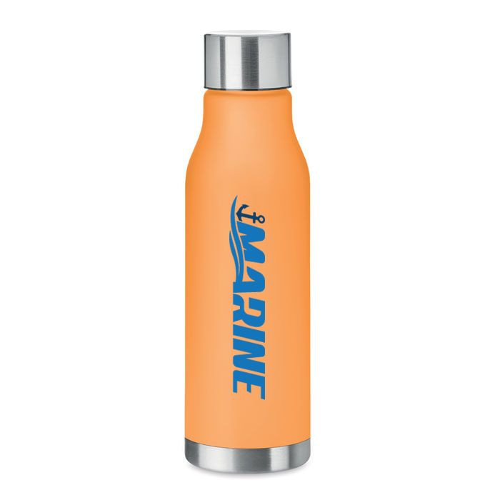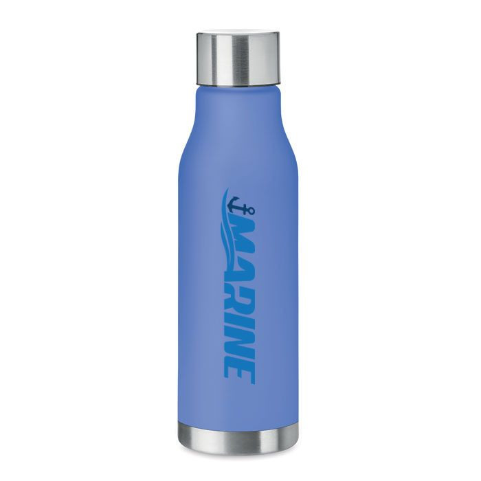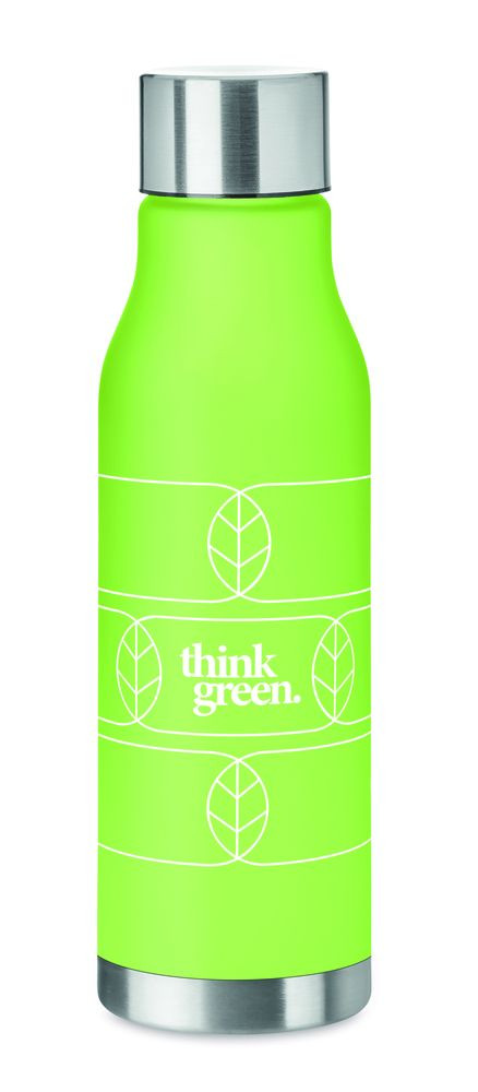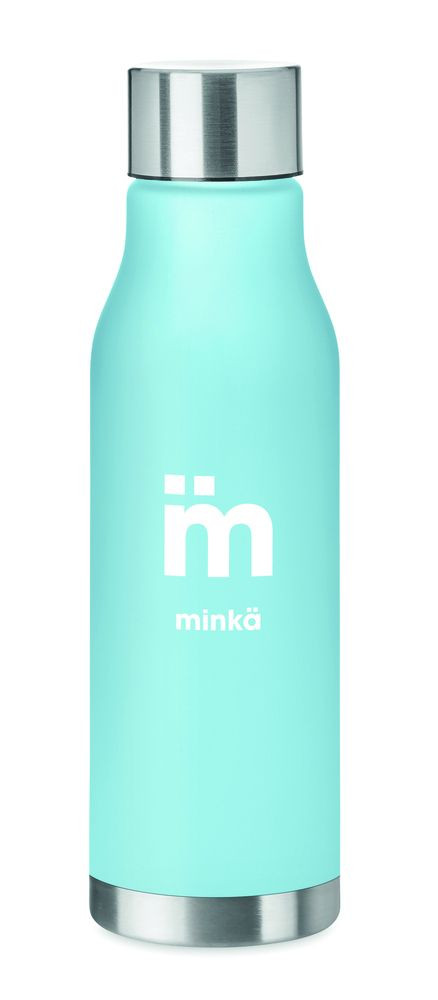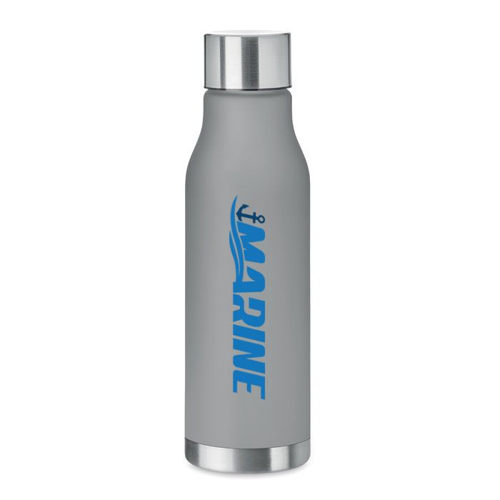 Drikkeflaske i RPET med gummieret finish og låg i rustfrit stål med indvendigt RPET låg og silikonering.