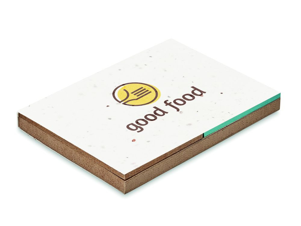 Notatblok med blødt betræk af frøpapir med 25 stk med notesblokke af græspapir 3 forskellige farvede markører.