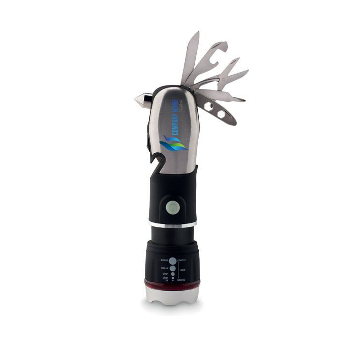 Flerværktøj med lommelygte, sikkerhedshammere og fræser.