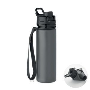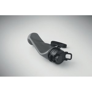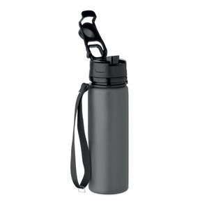 Sammenklappelig silikonesportsflaske med PP-låg, håndtag, polyesterstrop og gennemsigtigt spænde til fastgørelse i sammenklappet tilstand.