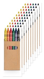 Kartonæske med 6 farvede farvekridt. 53 x 92 x 9 mm