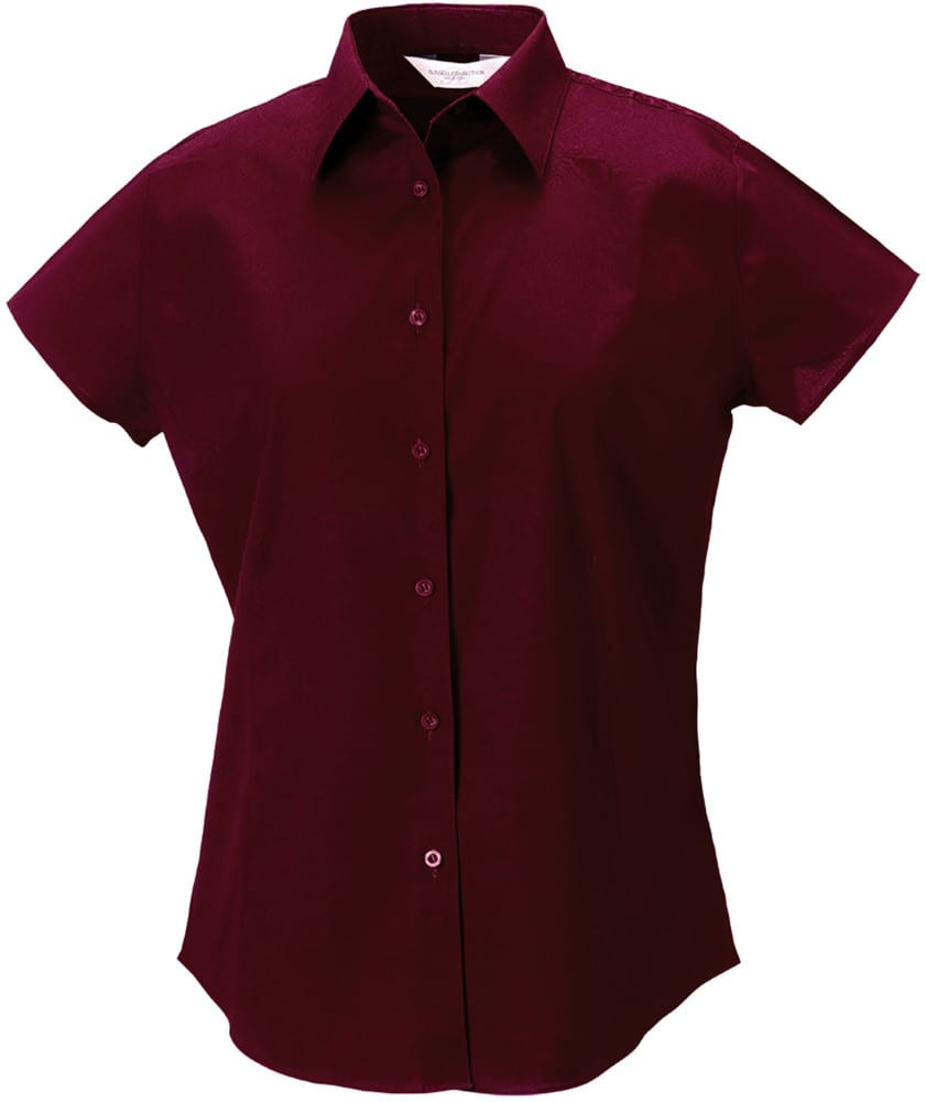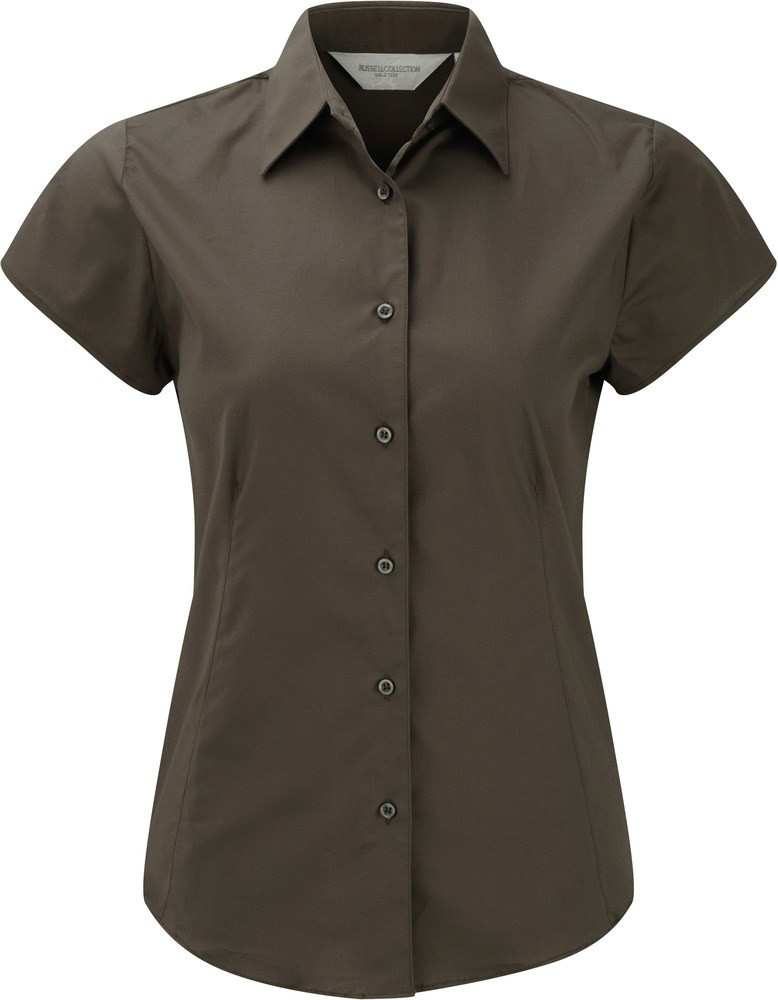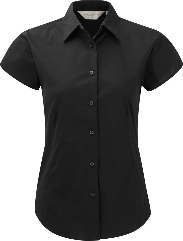 97% bomuld / 3% elastan poplin. Klassisk enkeltknapskrave. Stilfulde korte ærmer med kappe. Indsnit på bagpanelet og på frontkanten for en figursyet dameform. Rundet kant. Ekstra knapper.