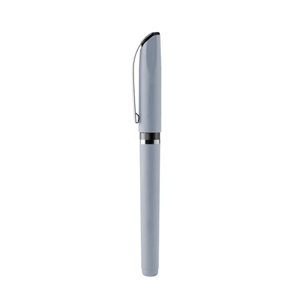 Features a cap with clip and metallic details.
